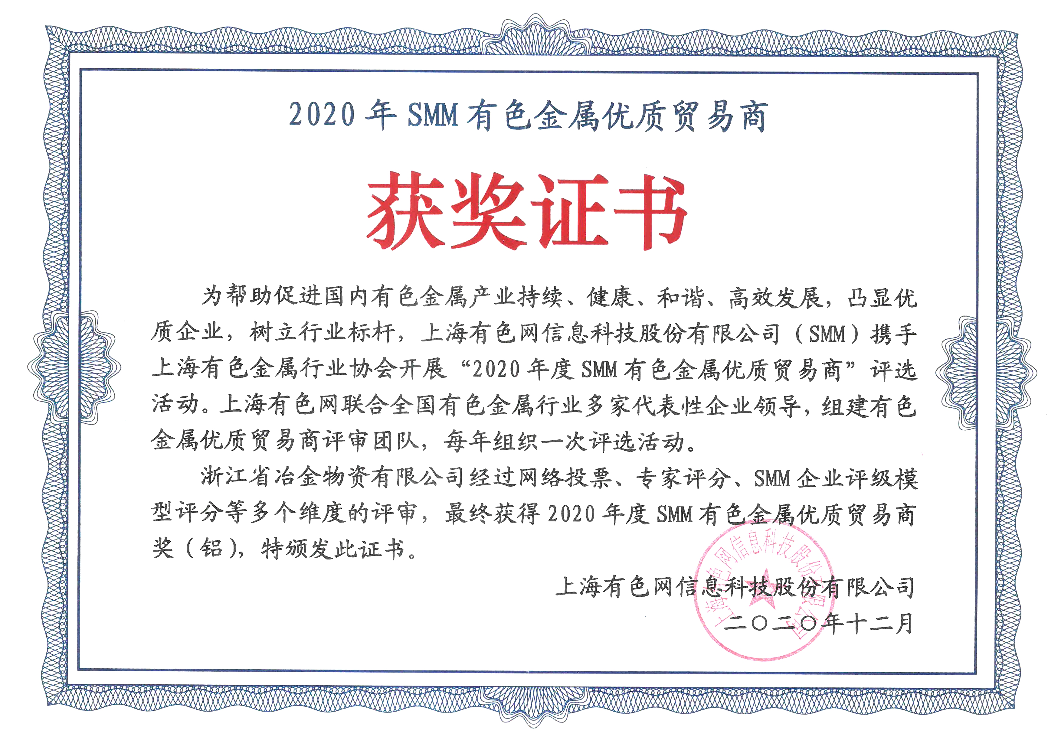 近日,浙江省冶金物資有限公司被中國有色金屬行業評為“2020年度SMM有色金屬質貿商,有力提升了冶金物資品牌,增強了市場競爭力。